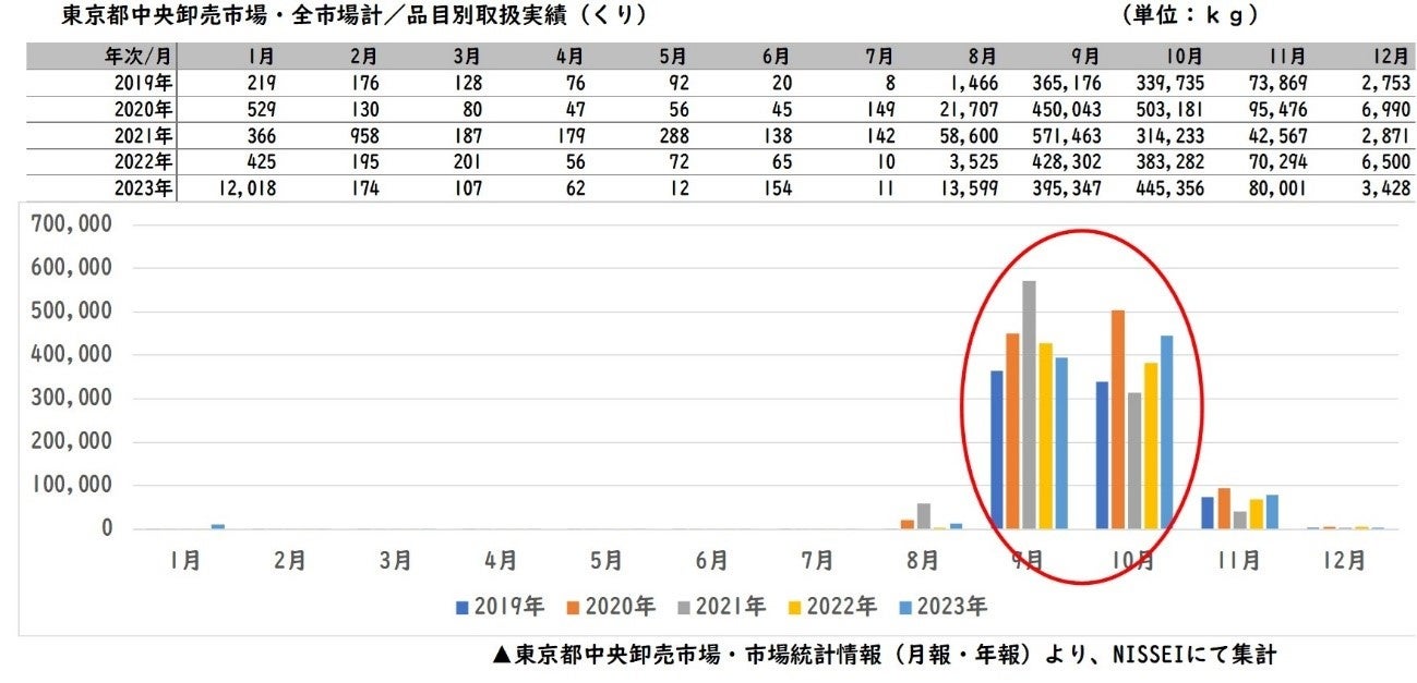 どの市場調査を読んでも、秋の味覚として「栗」があげられています。東京都中央卸売市場の取扱高、過去5か年間を集計すると、9月と10月に取扱い物量が集中しています。秋にしか食べられない旬の食材であることがわかります。