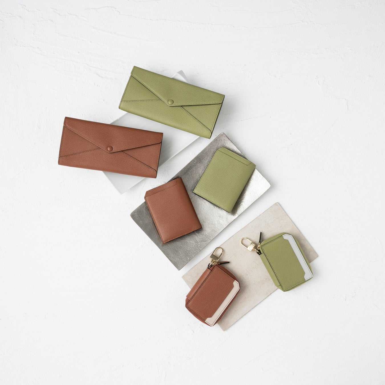 スリム設計ながら7枚のカードが収納できる点が人気の「スマートカードウォレット」、スマートキーだけでなくご自宅用のカギやカードなども収納することができる「スマートWキーケース」、カードが 6 枚入る長財布ながら薄さにこだわった「エンベロップ型ロングウォレット」が登場します。いずれのアイテムも、L’arcobalenoならではの絶妙な色味が特徴で、他人となかなか被ることのないオリジナリティあふれる1点です。