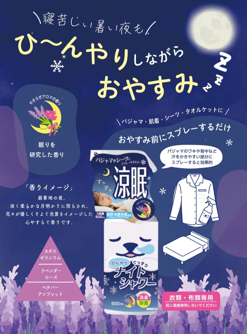 熱くて寝苦しい夜、お休み前の寝具やパジャマにシュッとスプレーするだけでひんやり&心地よい香りでスヤスヤお休みタイムに。「ひんやり ぐっすりナイトシャワー やすらぎアロマの香り」で熱帯夜も快適にお過ごしください。