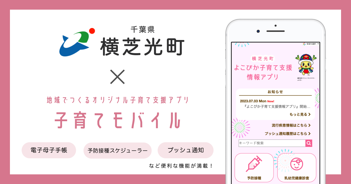 ライフスタイルの多様化による子育て世代のニーズの変化に伴い、一人一人の状況に合わせた子育て情報の発信や簡便な予防接種スケジュールツールを提供するため、国の「出産・子育て応援交付金(*)」を活用し、千葉県内 9自治体で取り入れられている 子育て支援アプリ「子育てモバイル」を導入する運びとなりました。横芝光町オリジナルのデザインを施し、子育て支援アプリ「よこぴか子育て支援情報アプリ」として提供いたします。