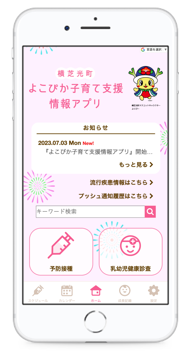 横芝光町の子どもたちが、「未来に向かってぴかぴかと光り輝いて育ってもらえるように」という想いを込めて「よこぴか子育て支援情報アプリ」と命名しました。トップページには、横芝光町キャラクター「よこぴー」が登場。横芝光町らしさが詰まった、こだわりのデザインでお届けします。