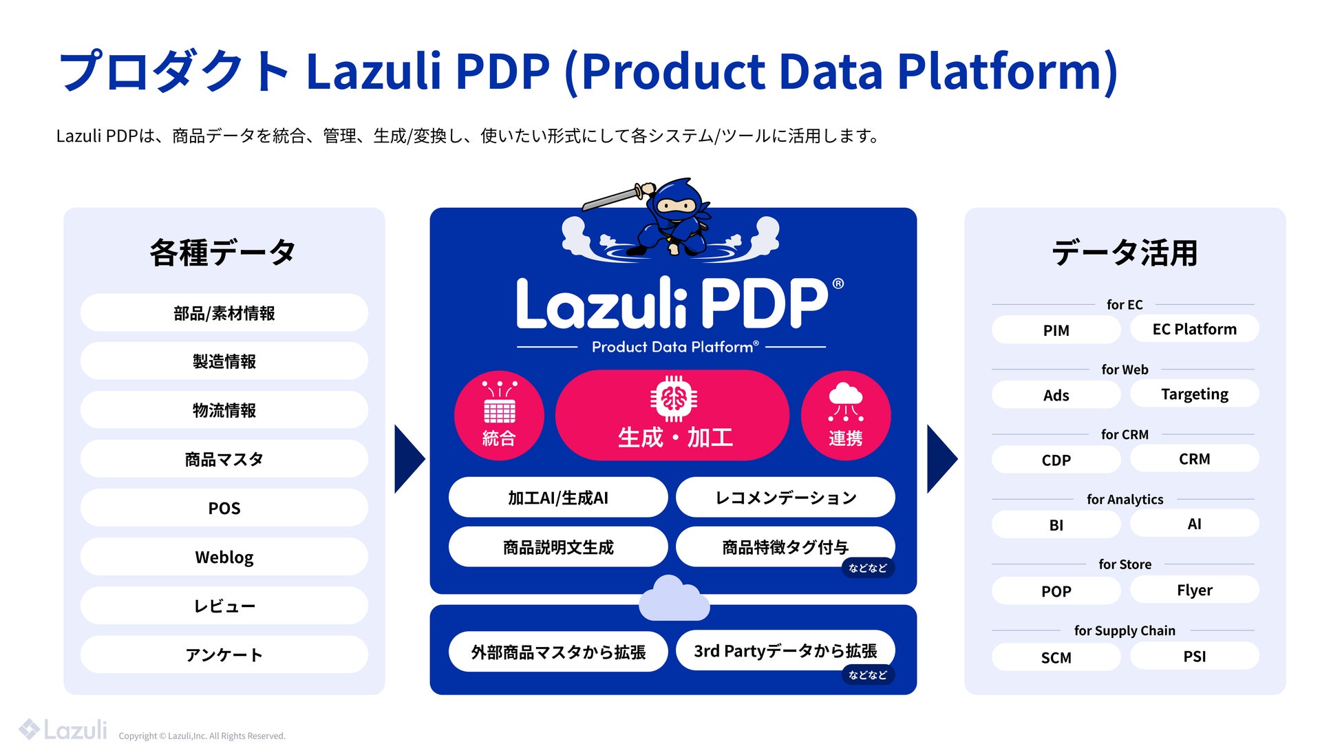 Lazuliが開発、提供する「Lazuli PDP」は、複数の外部データベースに点在していた商品情報を一括して管理し、データを活用しやすい形に整備、連携するためのクラウドサービスです。製造業者や小売業者などが保有する多様な商品マスタデータを、AIを活用して名寄せし、製品の特徴からメタタグの付与や関連付けを行います。これらの情報が「Lazuli PDP」を通じて、ユーザーに提供されます。