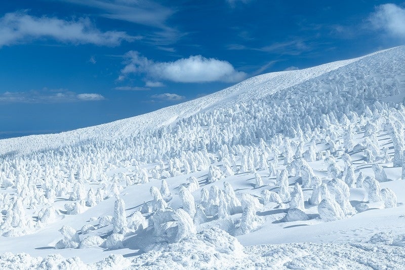 山形の冬の絶景「樹氷」。樹氷は世界的にも珍しく、国内外から多くの観光客が訪れます。蔵王連峰にシベリアからの季節風がぶつかり、多量の雪や過冷却水滴がアオモリトドマツの木々に長時間吹き付けることによって形成されます。12月下旬頃から成長し、大きくなった樹氷は「スノーモンスター」と呼ばれ、1月下旬から2月下旬までが見頃となります。