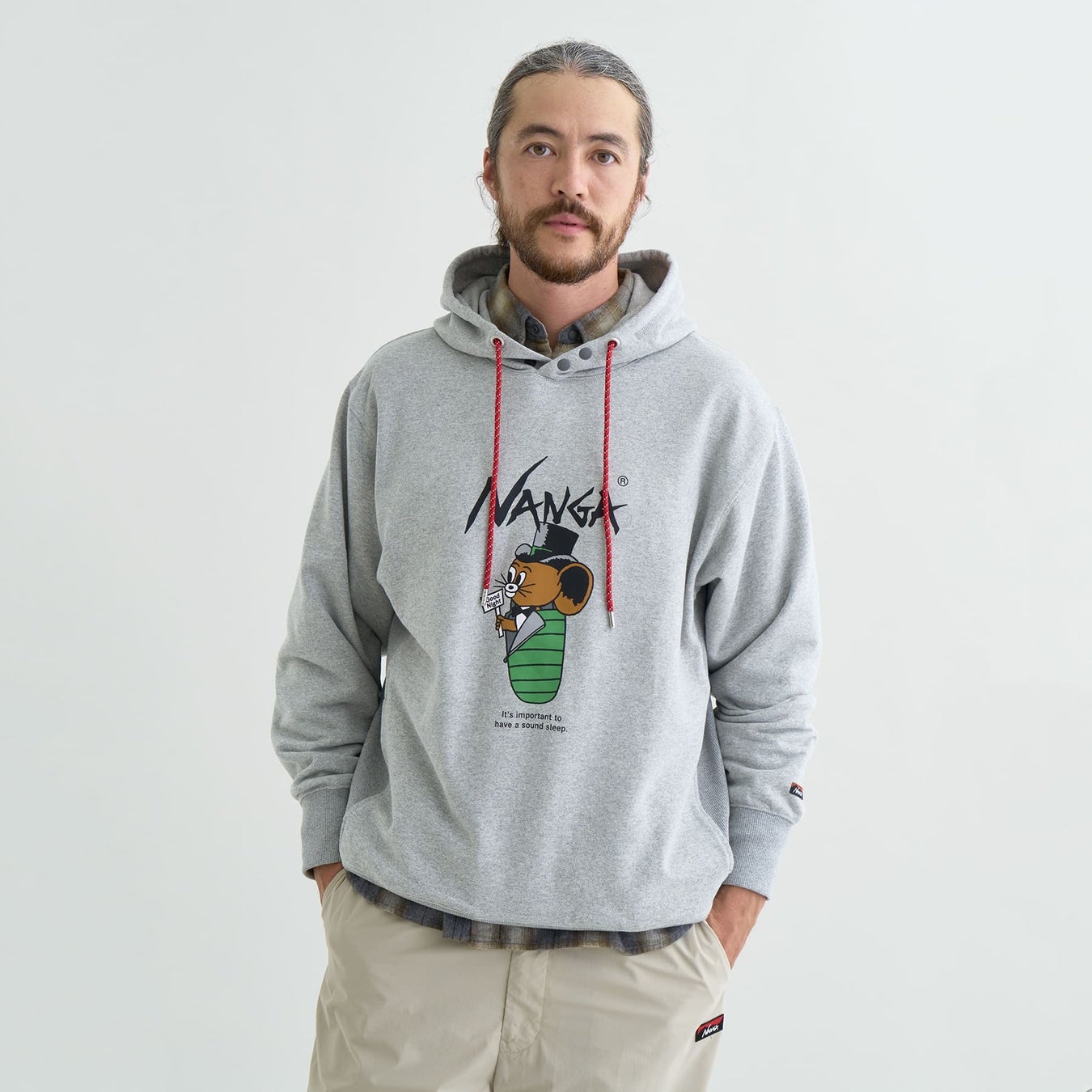 エコハイブリッドシリーズのフーディーに、ジェリー鵜飼氏が描くネズミのキャラクター「ジェリーマルケスくん」をプリント。寝袋に入っているという珍しいグラフィックは、キャンプサイトでも街でも注目の的?