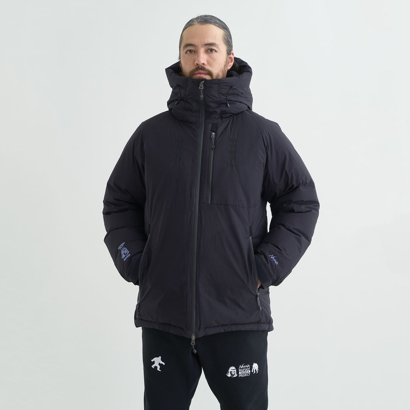 オーロラテックスダウンジャケットをベースに、タコマフジレコードでもお馴染みのモチーフを刺繍を施した限定アイテム。森羅万象を意味する「藝術科学思想自然」を左胸に、右胸にはNANGAの歩みを讃える「山岳厳冬実践英知」の文字が刺繍されています。
