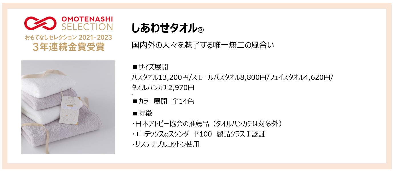 「しあわせタオル」は、革新的な織物技術を用いて、やわらかく吸収性に優れ、ふわふわした肌触りを生み出すだけでなく、研究によって自律神経のバランスにアプローチする点が画期的と評価され、本年度も金賞受賞となりました。また、「奇跡のタオル®」も同じく金賞を受賞していますが、3商品それぞれが異なる特徴を持ち、それらの特徴をつくりだす技術力や追求する姿勢が高い評価につながっています。
