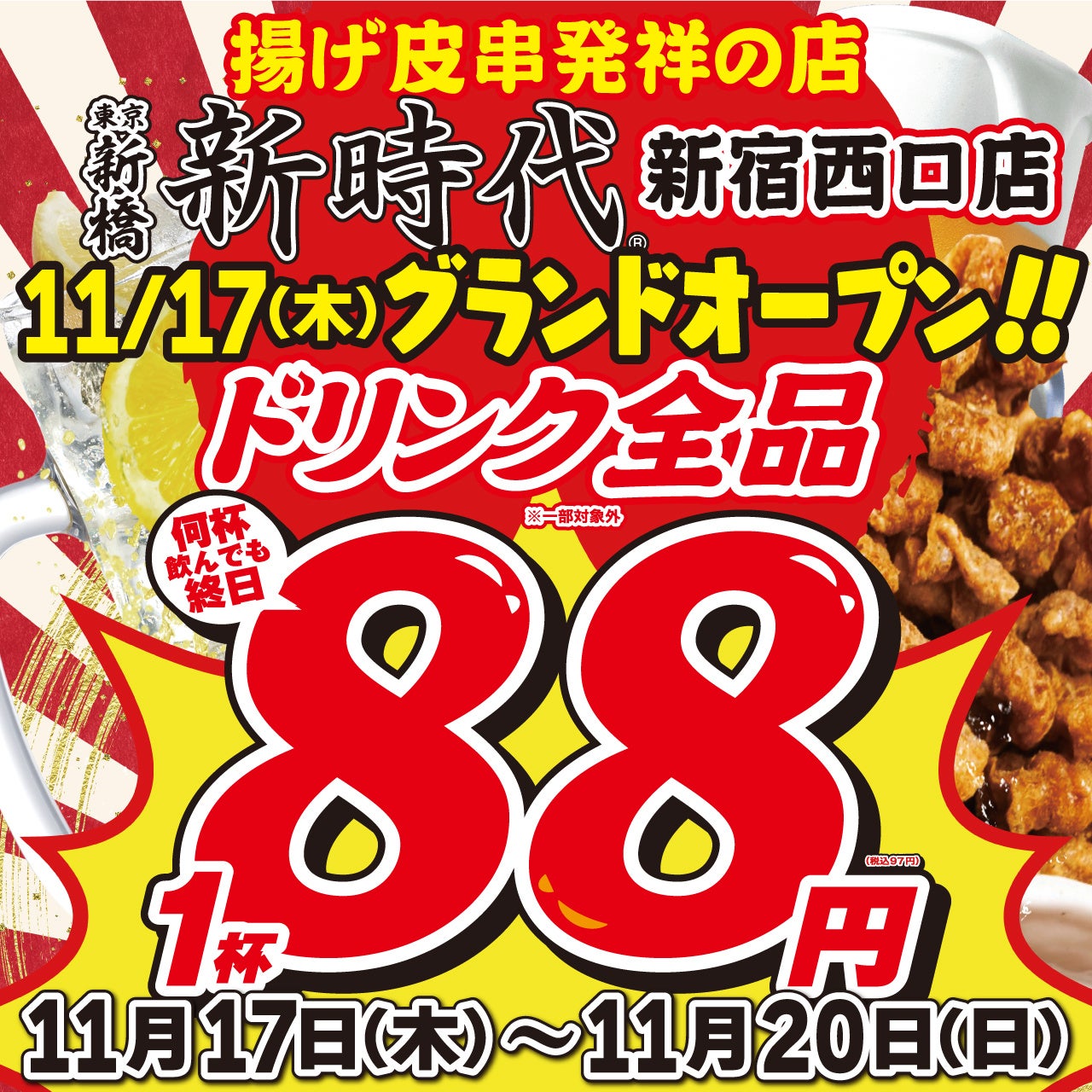 「新時代 新宿西口店」のオープンを記念し、ドリンク全品を1杯88円(税込97円)でお楽しみ頂けるキャンペーンを開催します。
