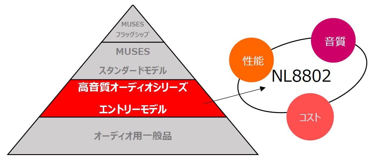 日清紡マイクロデバイスは、長年培った高音質化技術をベースにMUSESシリーズを代表とするさまざまなオーディオ用オペアンプをリリースしてまいりました。NL8802はMUSESシリーズのエントリーモデルとして、音質、性能、コストのバランスのとれた高音質オーディオ用オペアンプになります。±22Vの高い動作電圧を特長とし、高いダイナミックレンジが要求されるHiFiオーディオ機器や業務用オーディオ機器に最適です。