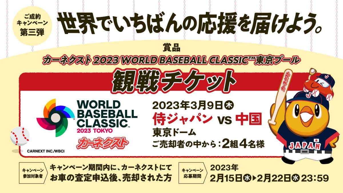 3月8日(水)からの開幕に向け、「世界でいちばんの応援を届けよう。」ご成約キャンペーン第三弾として、『カーネクスト2023 WORLD BASEBALL CLASSIC™東京プール』の観戦チケットをプレゼントするキャンペーンを展開いたします。キャンペーンを通じて、ファンの皆様と『カーネクスト2023 WORLD BASEBALL CLASSIC™東京プール』開幕に向けたより一層の盛り上がりを作ってまいります。