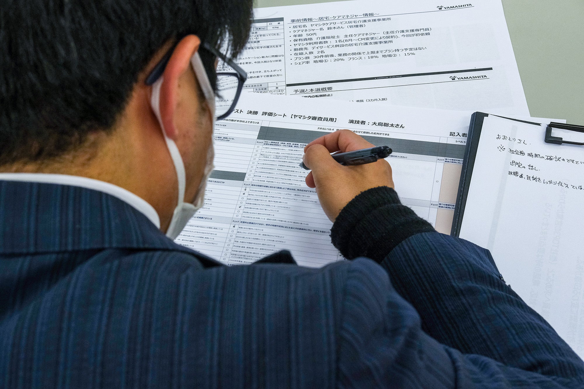 審査は、審査員9名(うち外部ケアマネジャー4名)および、演者2名(ご利用者役、ケアマネジャー役)による総合評価により実施。ヤマシタが対応スキルとして掲げる項目の中から、以下5項目を評価基準としました。
