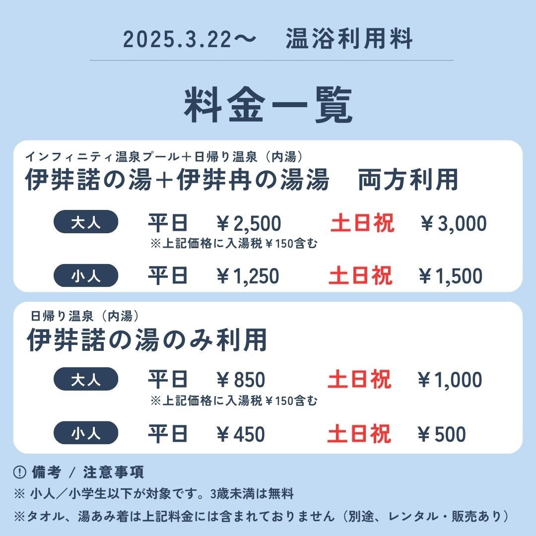3/22~3/23の期間限定でインフィニティ温泉をご利用いただいたお子様にソフトクリームを無料で提供いたします。さらに、リオープンに併せて通常入浴料金もプライスダウンいたしました!この春、ぜひご家族でお越しください。