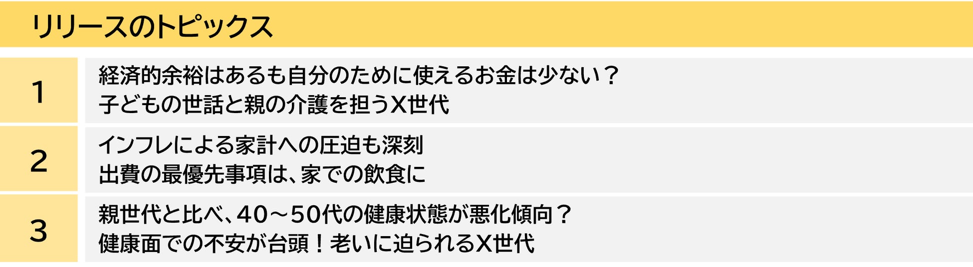 X世代は、子供と親のケア、経済状況の影響を受けながらの家庭での役割、加齢に伴う体調変化など、多重の負担に板挟みになる「サンドイッチライフ」を送っています。そこには、家族を大切にしたいという強い想いがありますが、満足できる自分の時間が確保できていないという現実が浮き彫りになっています。本リリースでは、X世代の消費行動や心理、課題解決へと導くビジネスチャンスについて解説します。