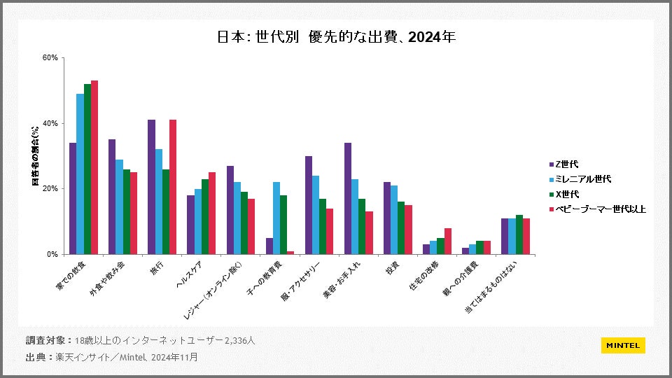 インフレに備える傾向が強いX世代は、家での飲食に最も優先的にお金を使います。以下、外食、旅行、ヘルスケアと続きます。X世代はZ世代やミレニアル世代ほどには服・アクセサリーや美容などの見た目には優先的にお金を使いません。また、ベビーブーマー世代と比べると旅行の優先度が低いようです。