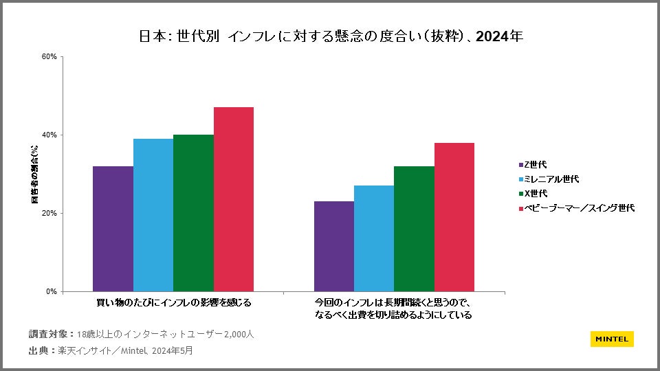 日本の場合、消費者のインフレに対する懸念の度合いを見ると、全体的に懸念はあるものの、アメリカの消費者ほど強くはないようです。しかし、X世代は若い世代と比べるとややインフレの影響を強く感じて備えようとする傾向が見られます。