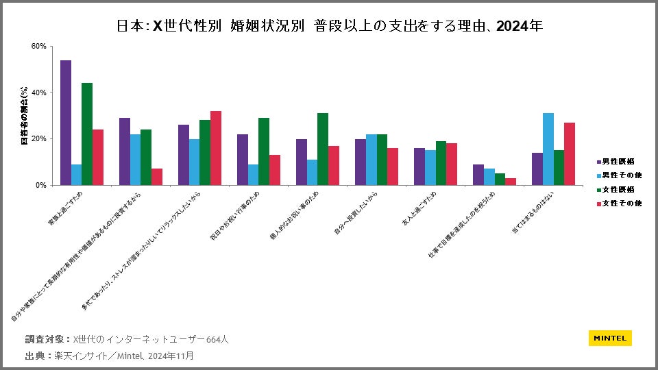 このように、X世代男性既婚者が経済的ゆとりはあるのに自分で自由に使えるお金が比較的少ないのは、彼らが主に家族のためにお金を使うからです。ミンテルが行った調査によると、X世代男性既婚者は「普段以上の支出をする理由」において、半数以上が「家族と過ごすため」と回答しています。