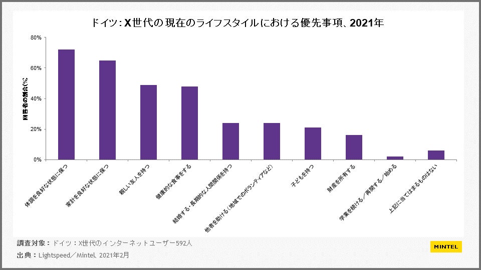 また、ドイツのX世代にとって、生活における最優先項目は体調と家計を良好な状態に保つことです。健康でないと働いて収入を得られませんし、病気になると医療費がかかるからでしょう。調査項目の選択肢に「財産を所有する」という項目もありますが、下位。財産を持つ以上に、現在の家計をなんとかやりくりしていく方が優先のようです。
