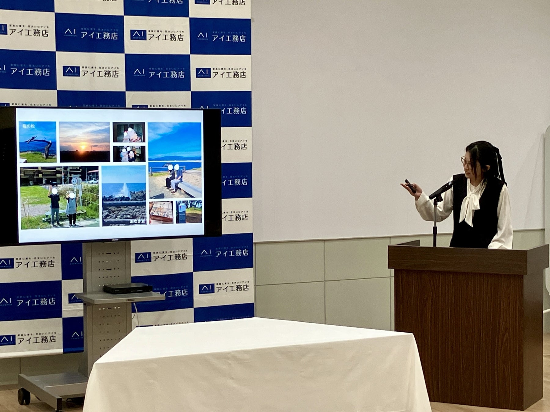 続いて、最優秀賞を受賞した東京藝術大学大学院 美術研究科デザイン専攻の音舞里(Nemuri)さんによる作品を発表。受賞デザインをもとに、十一代 大樋長左衛門氏が監修して日本酒ボトルを制作しました。完成品は、アイ工務店のロゴが表現されたボトルの形状から日本のシンボルである富士山と四季折々の草花をモチーフにした逸品で、来場者から大きな注目を集めました。その後、最優秀賞の音舞里(Nemuri)さん、優秀賞の京都美術工芸大学 小野寺 芽衣さんから海外視察旅行の報告プレゼンテーションも行いました。