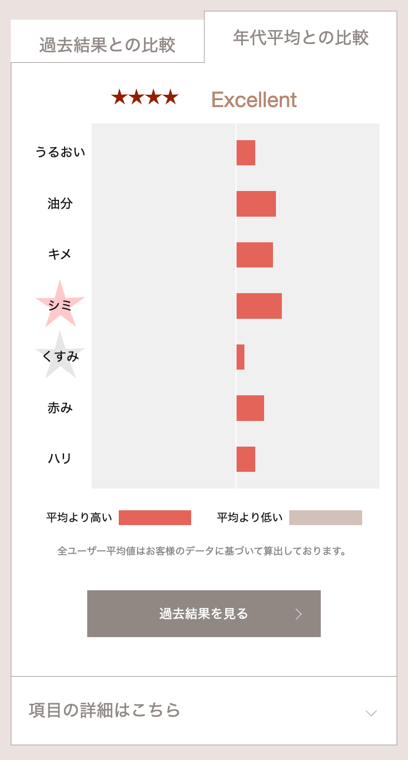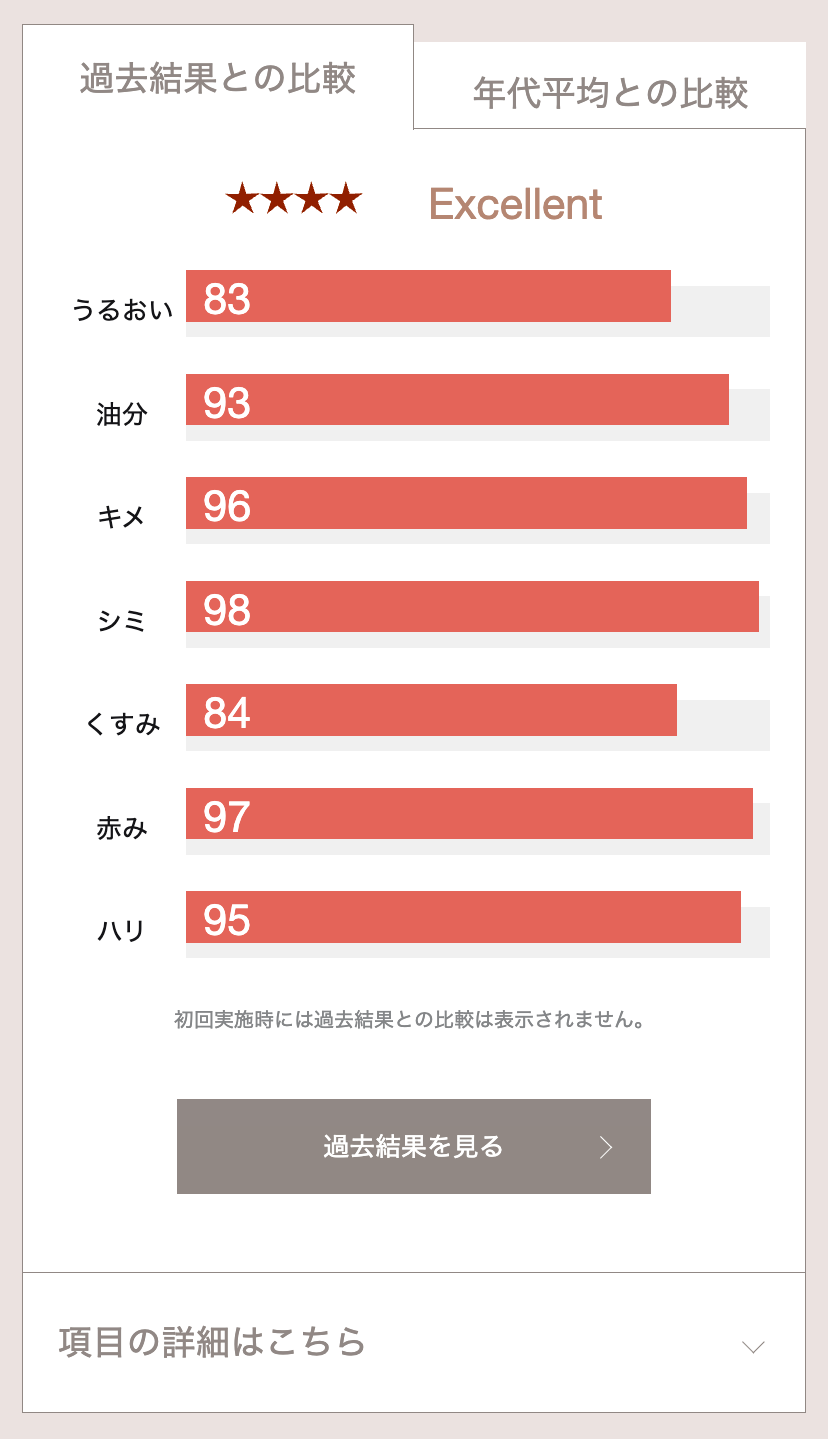 同年代平均値との比較や、LINEのアカウントと連携することでご自分の過去のスコア(最新の利用日から1年分)とも比較ができ、肌の状態の変化を見ることが可能です。