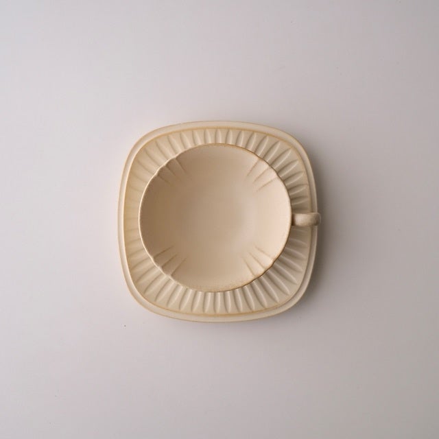 花を思わせる細部にまでこだわったレリーフがクラシカルな雰囲気を醸し出しているカップソーサー。広く浅いカップは紅茶を飲むのに最適。心地よいお茶の時間を楽しむことのできる一品です。本商品は、KURAMAE CANNELE CAFEでも使用をしております。