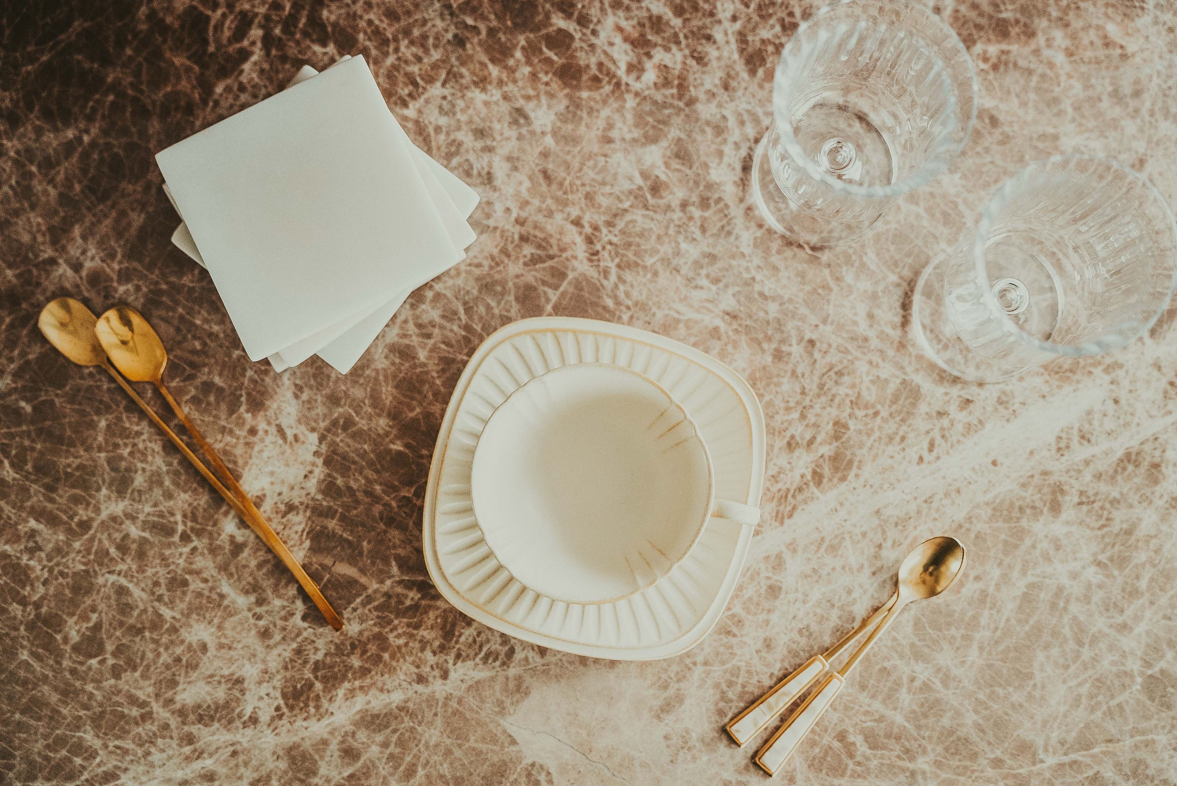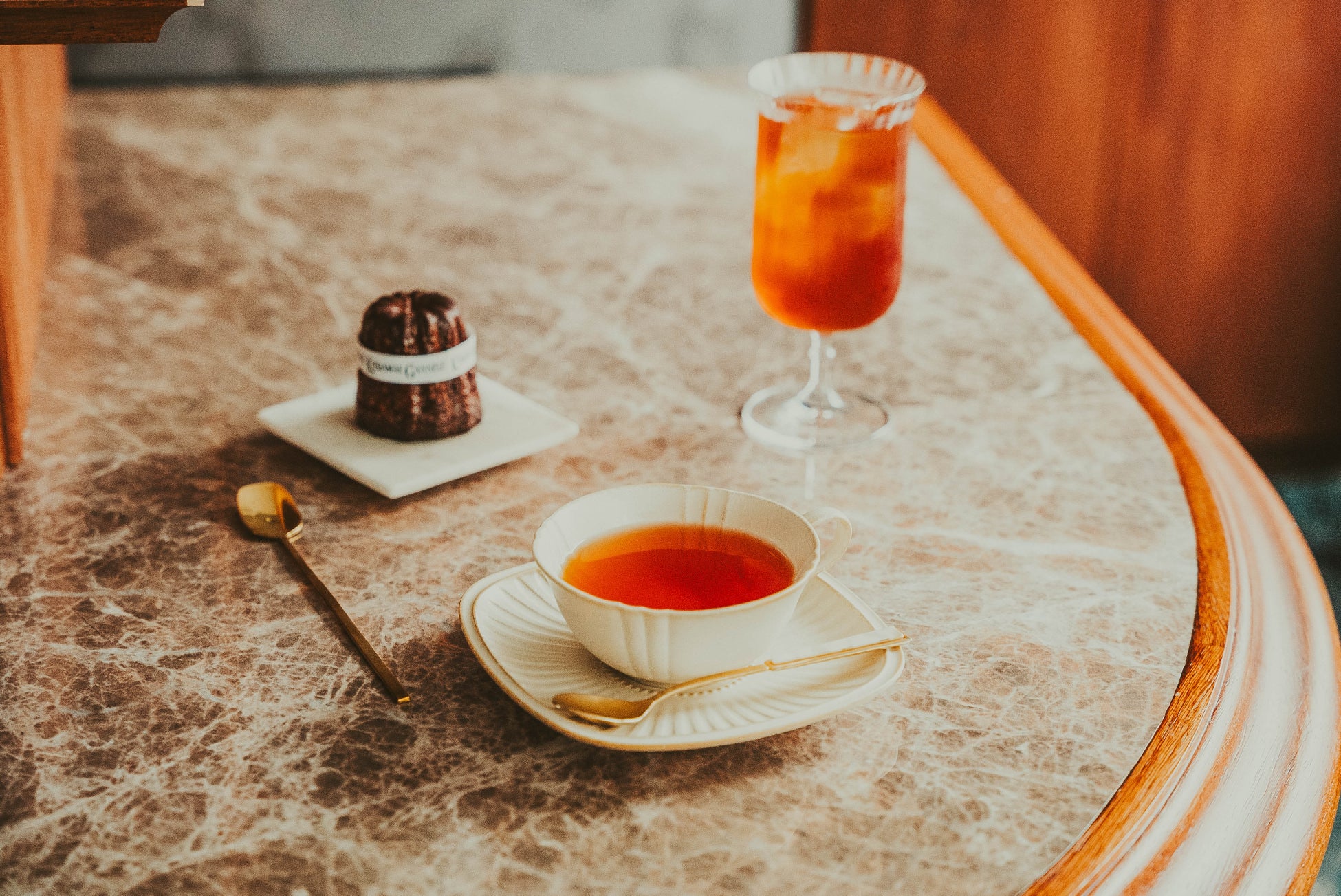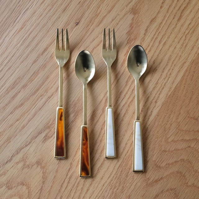 持ち手にマーブル模様のアクリルプレートがついたレトロな雰囲気の金色カトラリー。カラーは鼈甲のようなブラウンと、大理石のようなホワイトの2種類。ホワイトカラーのティースプーンは、KURAMAE CANNELE CAFEでも使用をしております。