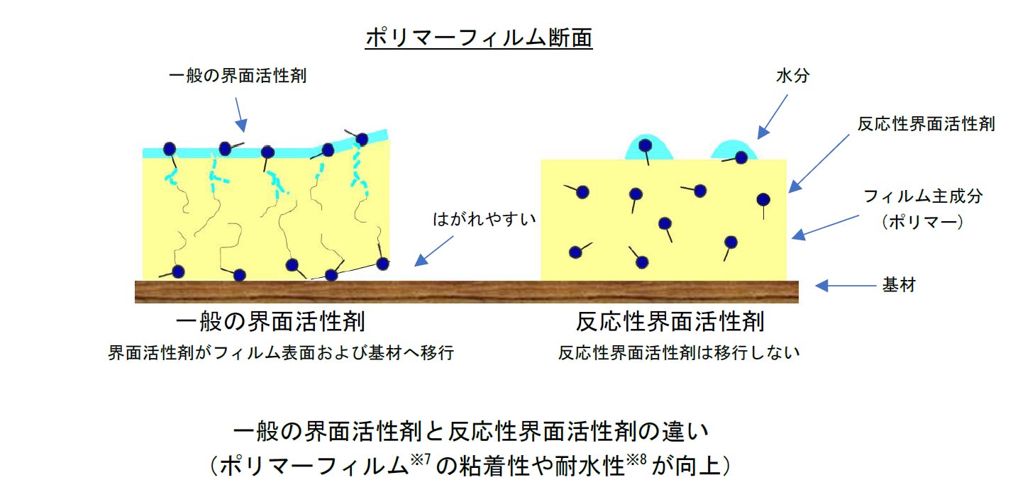 当社独自の技術で開発した反応性界面活性剤「アクアロン」シリーズは、塗料や粘接着剤の主成分と反応するため、一般的な界面活性剤で懸念される時間経過にともなう環境への溶出がほとんどありません。