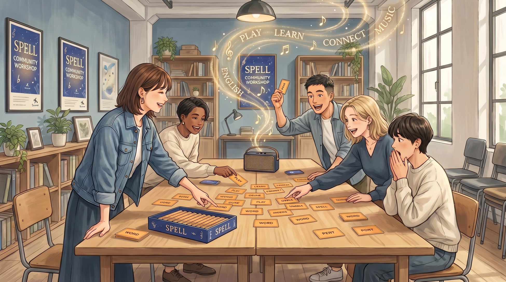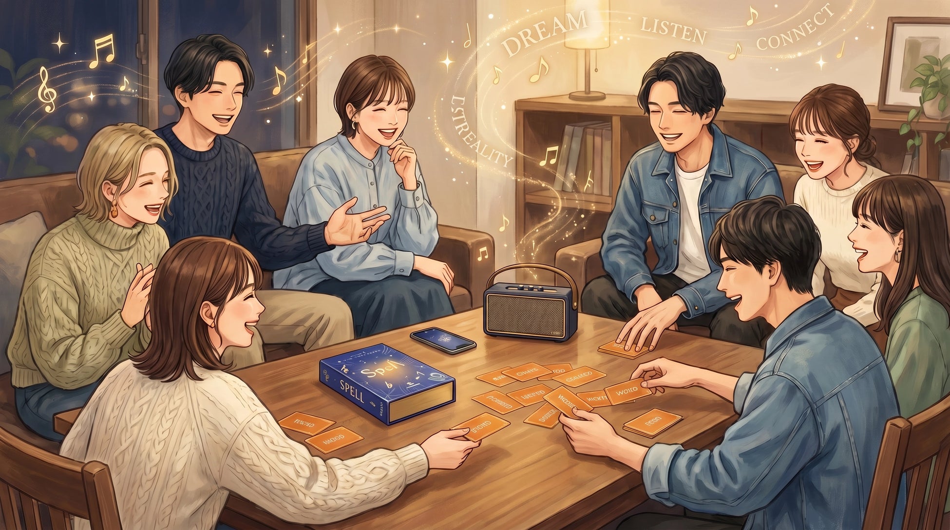 『SPELL』は、音楽を流しながら、聞こえた英単語に対応するカードを見つけて取るカードゲームです。ルールはシンプルで、準備も複雑ではありません。家族や友人、仕事仲間と一緒に、まずは“遊ぶ”ことから始められる点が特徴です。
