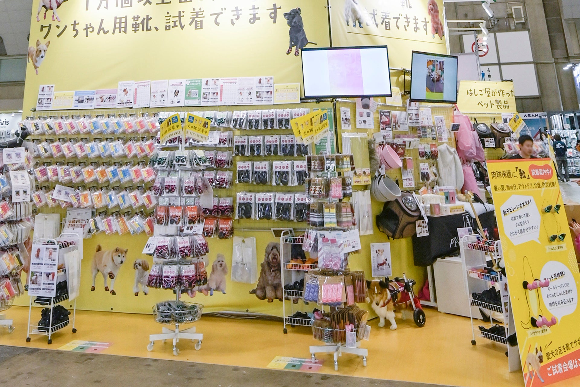 ペットアドバンスのブースでは、用途に応じた犬用の靴や靴下が豊富にラインナップしており、試着が可能です。