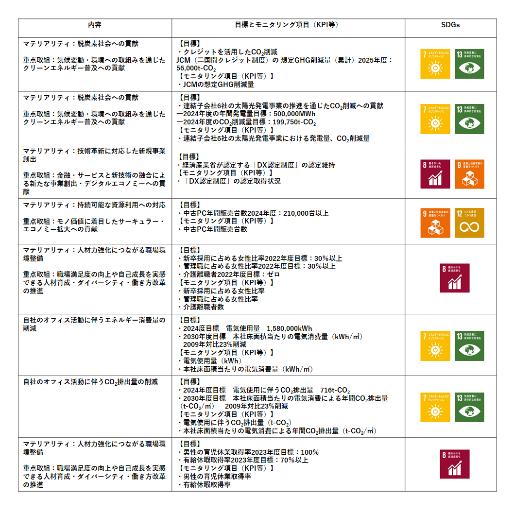 当社は、循環型経済社会の実現に貢献し、社会課題の解決と持続的成長を同時に推進するサステナビリティ経営に注力しております。また、10年後の未来も付加価値の高い金融・サービスを創出するために、SDGsを踏まえた5項目のマテリアリティを特定するとともに、サステナビリティ経営の推進に向けて、マテリアリティに紐づくKPIを設定したPDCAサイクルも実践しております。