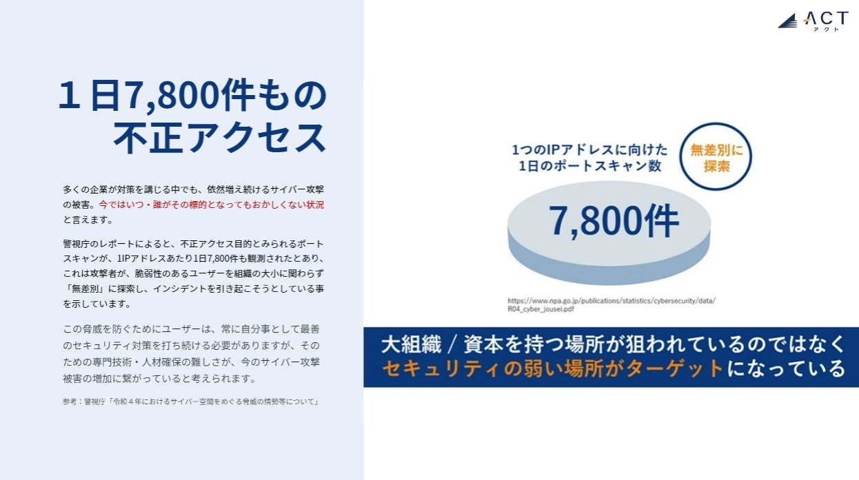アクトはサイバーセキュリティ事業を展開しており、企業へのランサムウェアなどのサイバー攻撃に対するセキュリティ支援を行っています。