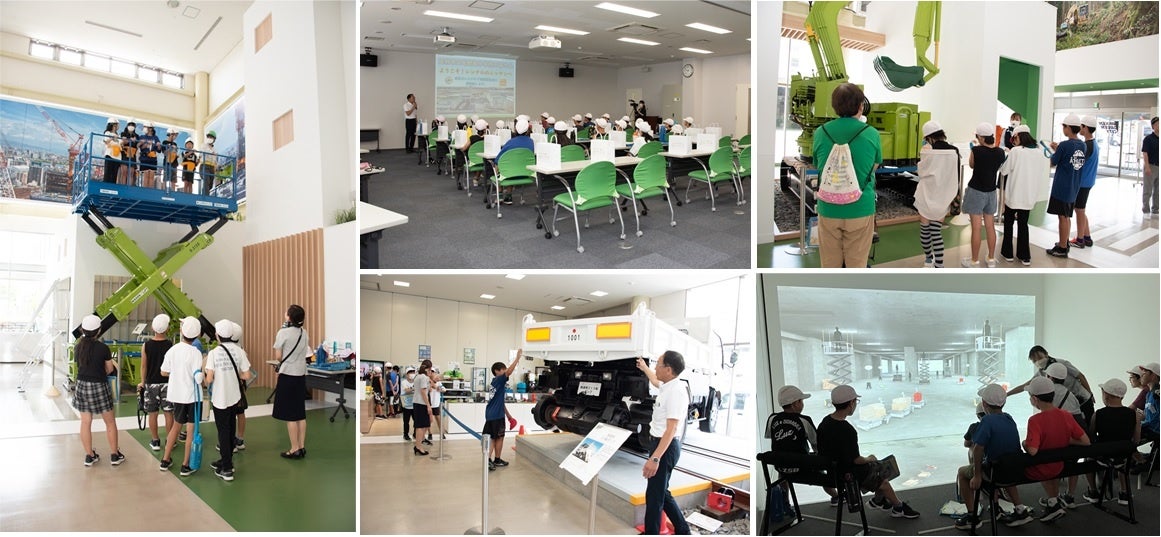 当日は、当社が活躍する業界の過去、現在、未来をご覧いただける「ニッケングリーンシティ」をご案内しました。大型の建設機械の見学は勿論のこと、様々な自社開発商品の中から、世界で初めて車幅内旋回を可能にした掘削機「コーヒーカップ式バックホー」の紹介や、道路と線路の両方を走行できる「鉄道用ダンプ」、自動で人に追従する台車「かもーん」を使用したデモンストレーション、高所作業車の搭乗体験なども行われました。見学中には、施設内外の展示商品を子どもたちに実際に見て・触って・体感して、楽しみながら学んでいただきました。