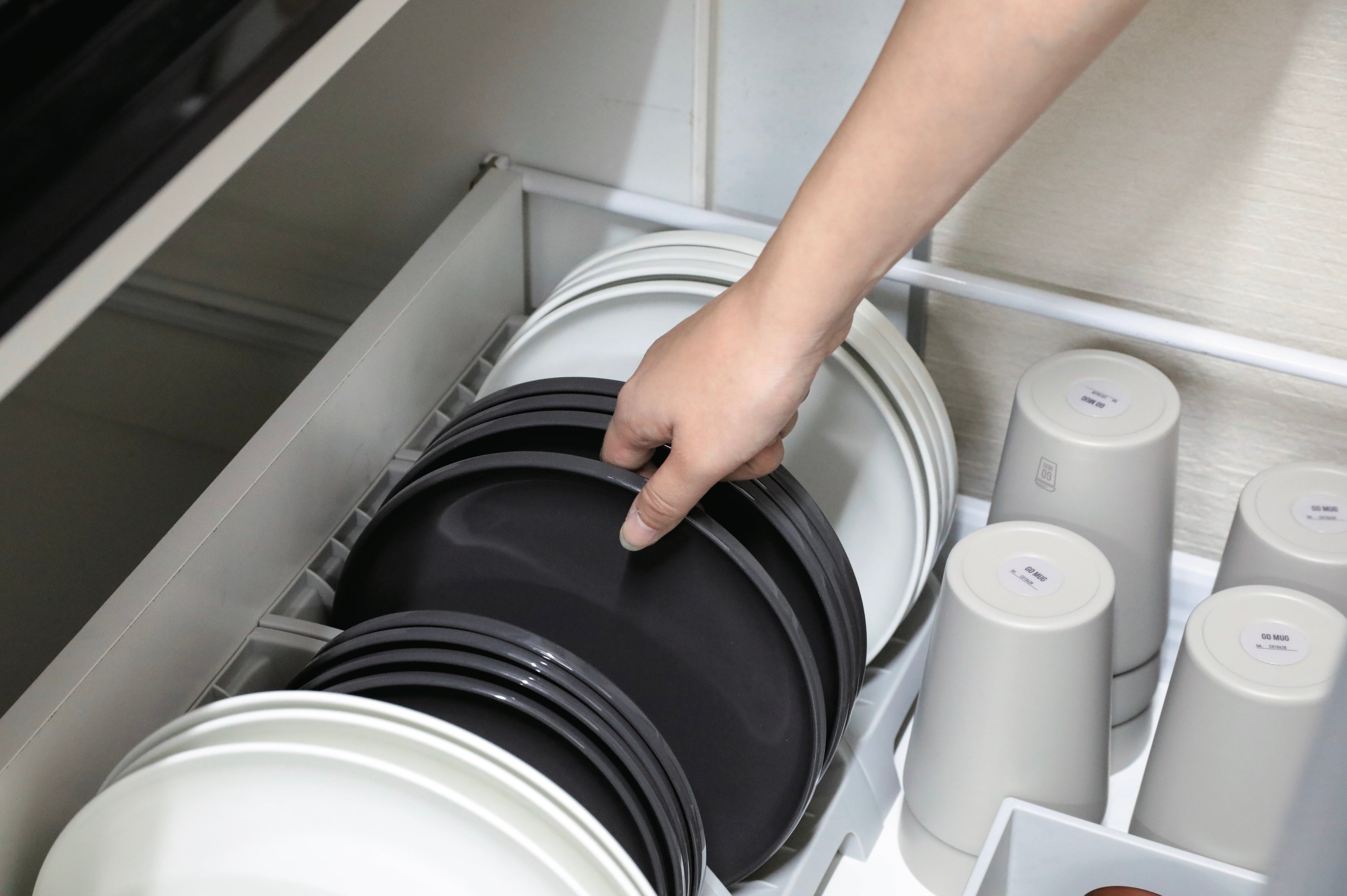 食器を重ねて置くのでは無く立てて収納出来るので、取りたい食器をすぐに見つけられ、迷わずすぐに取り出せます。