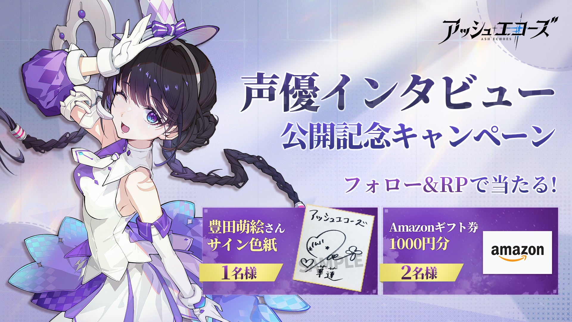 キャンペーン内容:フォロー&RPで、抽選で1名様に豊田萌絵さんのサイン色紙、2名様に1000円分のAmazonギフト券 をプレゼント