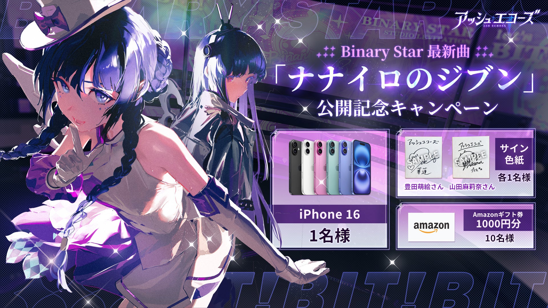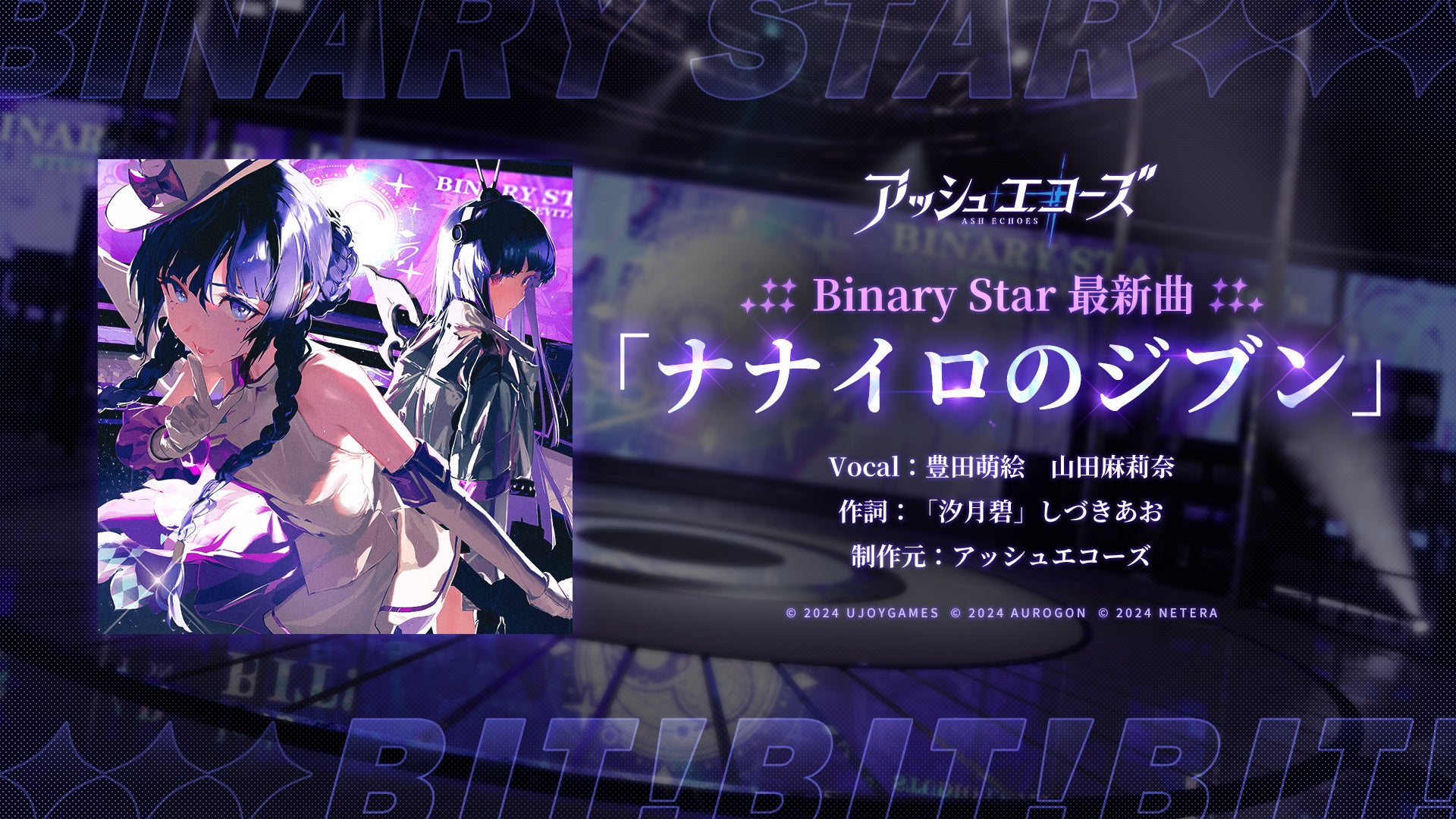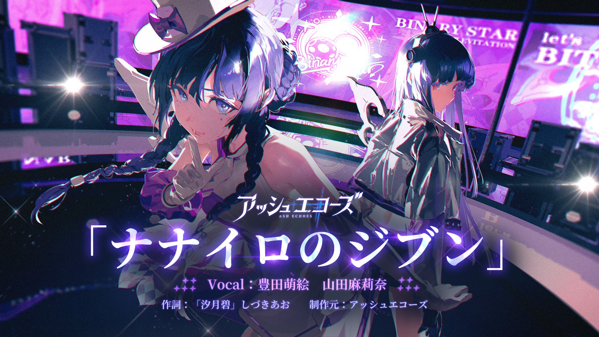 この度公開されたのは、『アッシュエコーズ』作中のアイドルユニット「Binary Star」がリリースするニューシングル「ナナイロのジブン」。こちらは、本作に登場する同調者(エコーラ)である、華蓮(cv.豊田萌絵)&プリス(cv.山田麻莉奈)が歌う、近未来感溢れるナンバーです。アップテンポなメロディや「唯一無二の自分が輝く」がテーマの歌詞、パワフルで凛とした豊田萌絵さん、山田麻莉奈さんの歌声を楽しむことができます。