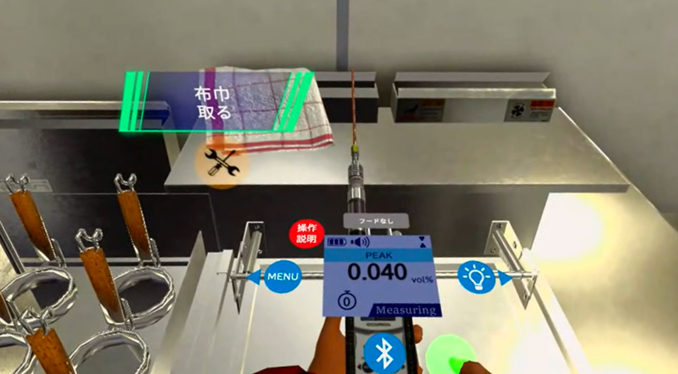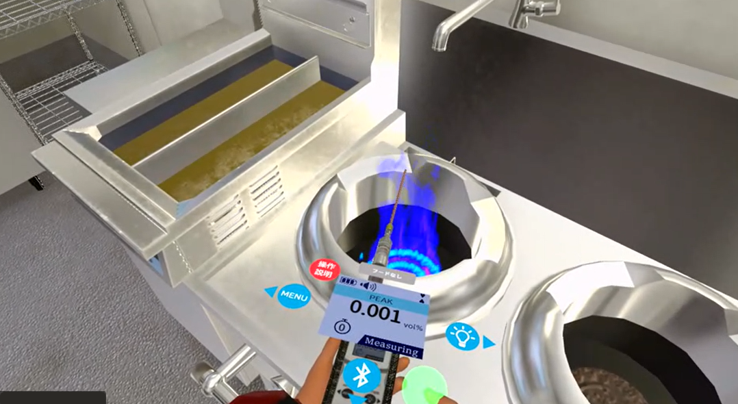 VRを用いた実践的なガス漏れ対応訓練にて、一酸化炭素測定器や可燃性ガス探知器等を提供