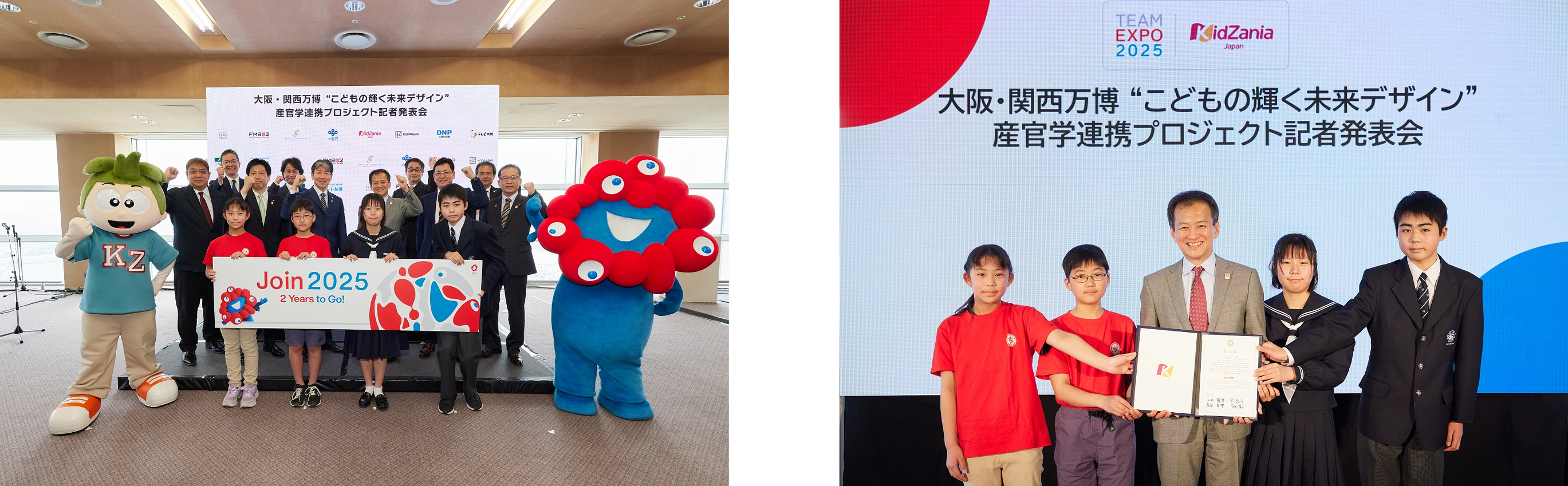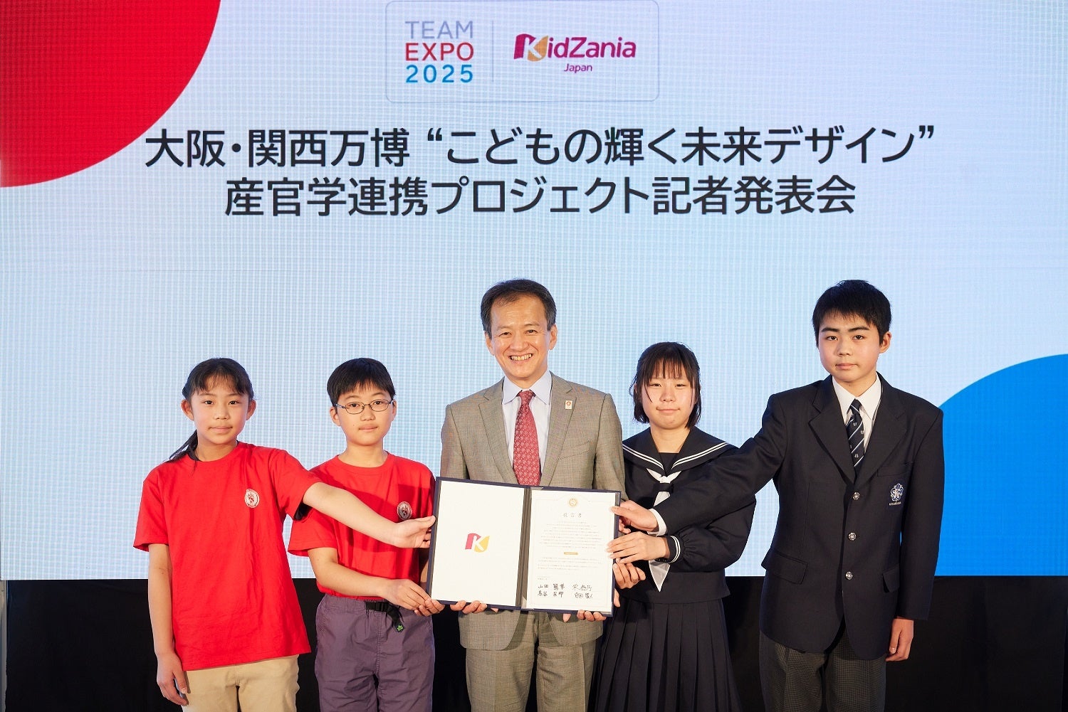 本プロジェクトの最初の活動として、こども達を代表してキッザニア甲子園こども議員の小学生2名が、公益社団法人 2025年日本国際博覧会協会 西貝宏伸機運醸成局担当局長へ「提言書」を手渡し、大人へ向けたメッセージを伝えました。