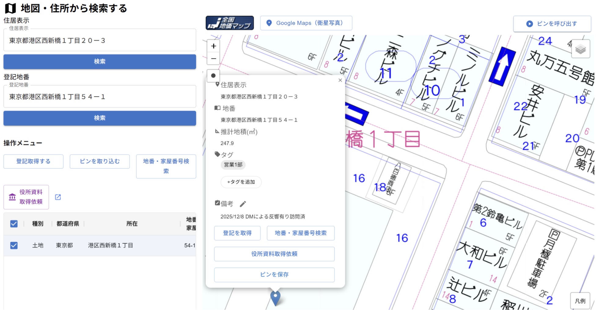 「R.E.DATA」が持つ「地図上のピンへのメモ機能」や「ハザードマップ表示」、「不動産属性データ(登記情報等)」と、ブルーマップの高精度な情報を重ね合わせて利用できます。これにより、より多角的かつ効率的な不動産営業活動が可能となります。