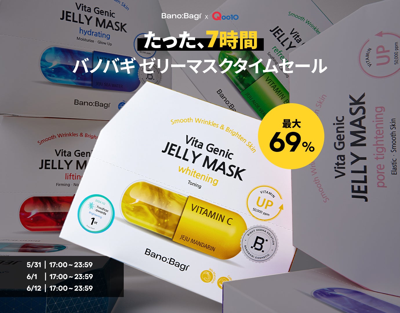 さらに、バノバギのベストセラー製品「ビタジェニックゼリーマスク」を最大69%割引でご購入いただけるお得なタイムセールも実施いたします。2025年4月時点で累計8,000万枚を販売し、タイのWatsonsアワードでは6年連続第1位を獲得するなど、多くの人々に愛されている「ビタジェニックゼリーマスク」は、今回のタイムセールにて全3回にわたり展開予定です。対象商品は10枚入りと30枚入りの2種類で、詳細はバノバギQoo10公式ショップにてご確認ください。