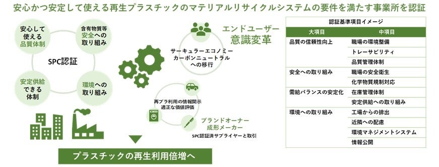 ※SPC(Sustainable Plastics Certification)認証制度:再生プラスチックに関するエンドユーザーの理解を促進し、再生プラスチック需要者の適正評価と使用量拡大につなげるため、需要者側が安心かつ安定して使える再生プラスチックのマテリアルリサイクルシステムを第三者が認証する制度。2024年夏頃からの本格始動を目指して準備中。