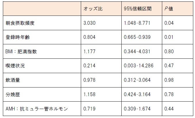 調整後、 ART 成績の多変量解析を行 いまし た。患者を 1 週間の朝食 の摂取頻度に基づいてグループ分けし解析したところ、毎日 6 ,7 回 週) 朝食を摂取する群は、他の群と比較して ART 治療後の生産率が高く、流産率が低いことが示されました。毎日朝食を摂取することは、良好な ART 成績と関連していました 。本研究の結果は、ART において毎日朝食を摂取することの重要性を示唆しています。(表 1)