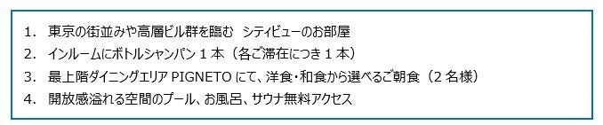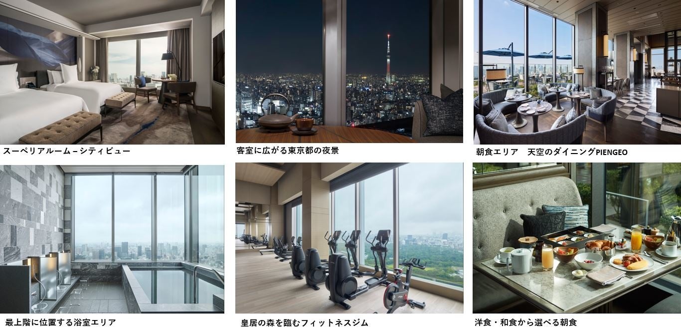 対象プランには、客室にプレミアム感高まるボトルシャンパンのご用意、滞在中は都心の絶景を背景に自然光が注ぎ込むプールエリアやお風呂のご利用、お泊りの翌日にはホテルの最上階に位置する天空のダイニングエリアでのご朝食が含まれます。