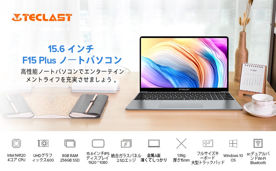 15.6インチのフルHD IPSディスプレイを利用しています。解像度は1920x1080で、1080Pビデオをサポートしています。視野角が広く、どの角度から見ても自然な発色が提供できます。内臓カメラ、スピーカー付きで、家庭で映画鑑賞可能です。重量はわずか1.8kg、厚さは15mmで、軽量でポータブルの利点があります。140mm×95mmタッチパッド、テンキーデザインのフルサイズキーボード、入力をより効率的にし、操作性も向上しました。