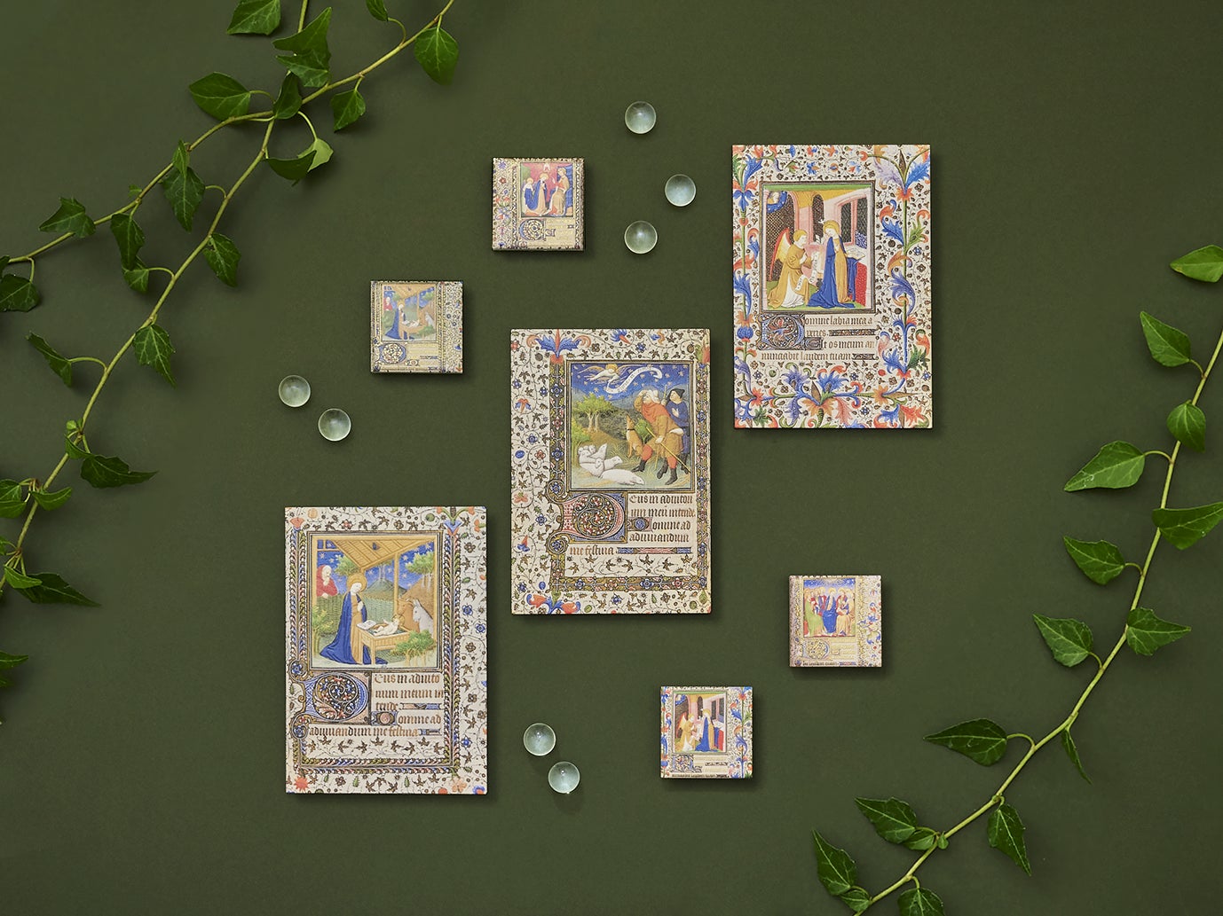 古川美術館の所蔵代表作品『ブシコー派の画家の時祷書』は、古川美術館で開催する「藤森兼明-祈りの輝き」(会期:2025年10月25日(土)~12月21日(日))の期間中に特別展示される作品です。ポストカード・マグネットともに、聖母のエピソードなどをとらえた扉絵に描かれた神聖な人物像や動物たち、自然のモチーフ、そしてそれを取り巻く華やかな装飾に凹凸をつけて立体化しています。さらに、聖母マリアを象徴する「青」の美しさが際立つよう、美術館と相談を重ねて発色を調整し、原本の魅力に近づけました。繊細で華やかな写本の世界を、ぜひお手元でお楽しみください。