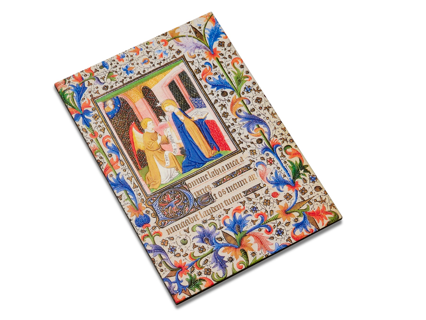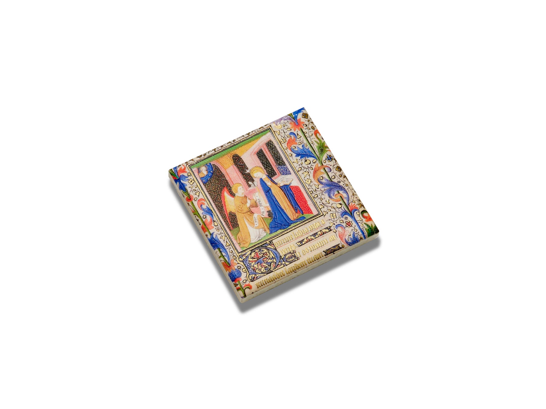 「受胎告知」は、大天使ガブリエルが聖母マリアに、救世主の誕生を告げる神秘的な場面が描かれています。金色に輝く天使の羽根や、象徴的な百合の花、マリアの静謐な表情を、微細な凹凸を加えることで立体的に再現しました。背景の華やかな装飾模様にも起伏をつけることで奥行きを表現しています。神聖な瞬間を閉じ込めた中世の小宇宙を、手のひらで味わえる特別なアイテムです。