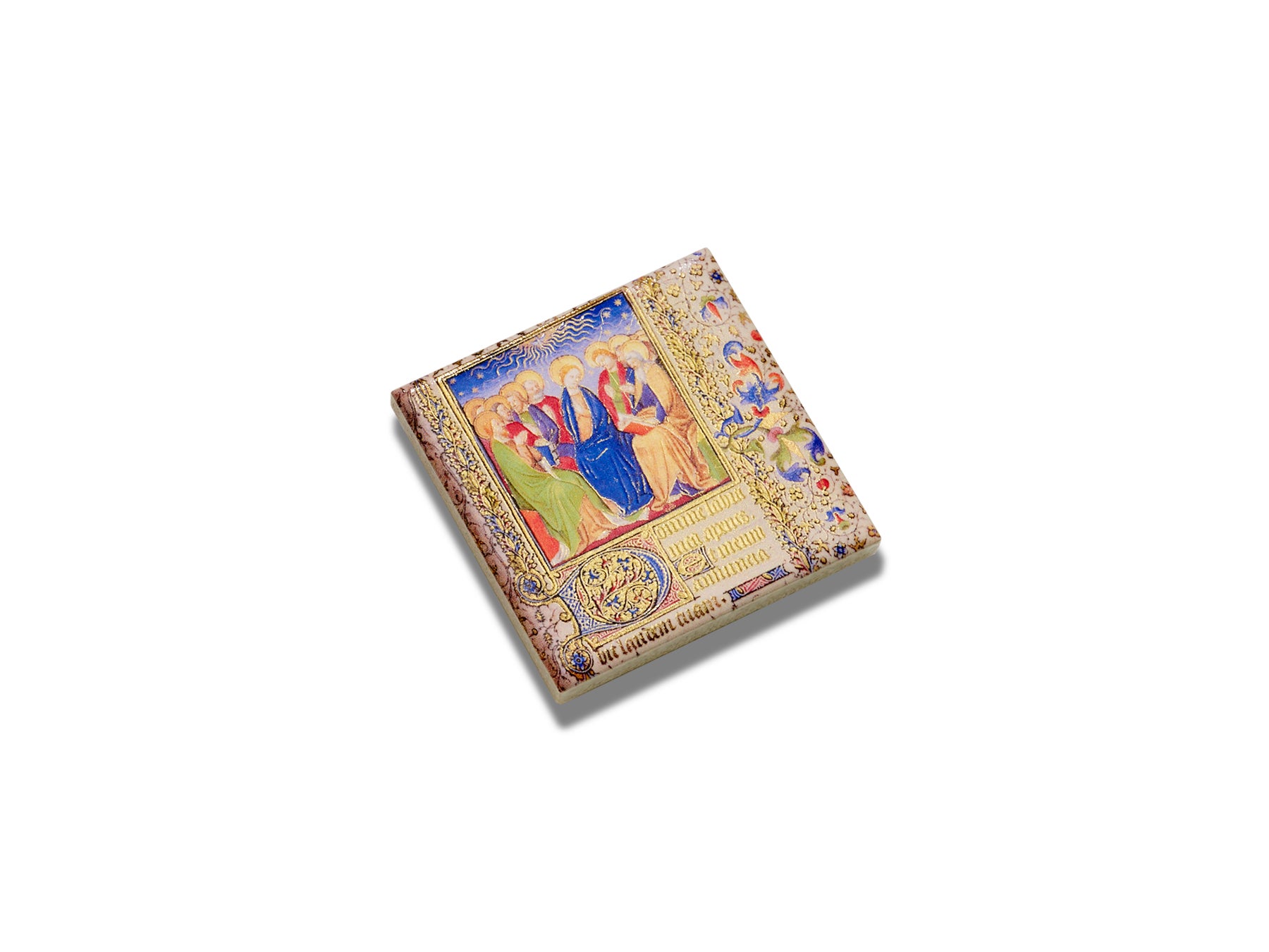 「聖霊降臨」は、聖母マリアを中心に使徒たちが集い、天からの聖霊を受ける瞬間が描かれています。静かに祈りを捧げるマリアの気高い姿を中心に、人物ひとりひとりの表情や仕草、差し込む光の広がりを微細な凹凸で浮かび上がらせています。祈りの静けさと祝福の高まりを指先から広がるように感じられる特別なマグネットです。