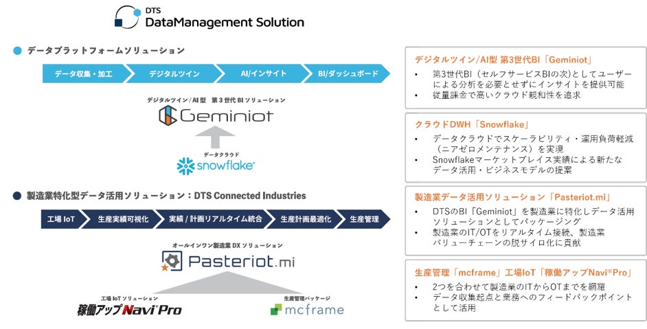 DTS DataManagement Solutionは、今後のDTSのデータ活用ソリューションの方向性を具体的な形にしたソリューションです。データ活用のキーテクノロジーとなるデータプラットフォームソリューションと製造業特化型データ活用ソリューションDTS Connected Industriesをそれぞれ深化・発展させつつ、他の業種・業界に向けても同様のフレームワークで業界特化型データ活用ソリューションを順次提供していきます。