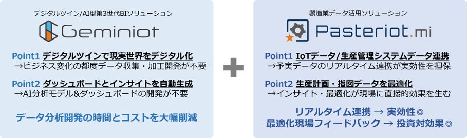 製造業データ活用ソリューションPasteriot.miは、Geminiotをコア機能として、製造業向けのIoTデータ入力インタフェース、生産管理システム連携機能をパッケージングしています。IT(インフォメーションテクノロジー)とOT(オペレーションテクノロジー)のデータを一元管理し、AIがインサイトを導き出し生産管理システムを通して現場にフィードバックすることで、実効性・投資対効果の高い製造業DXを実現します。