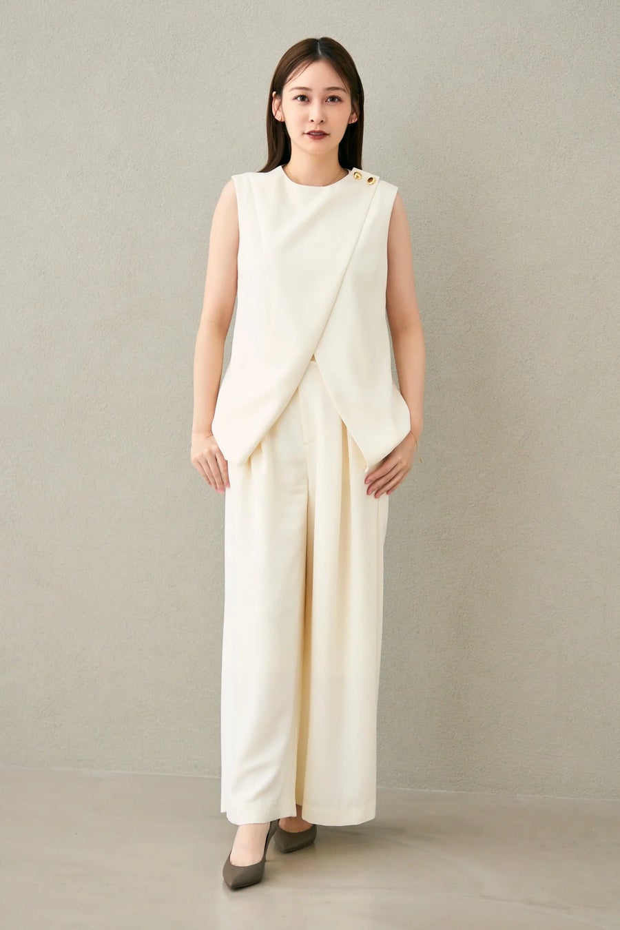 トップスは左肩のゴールドボタン、折り重なる構築的なライン。
