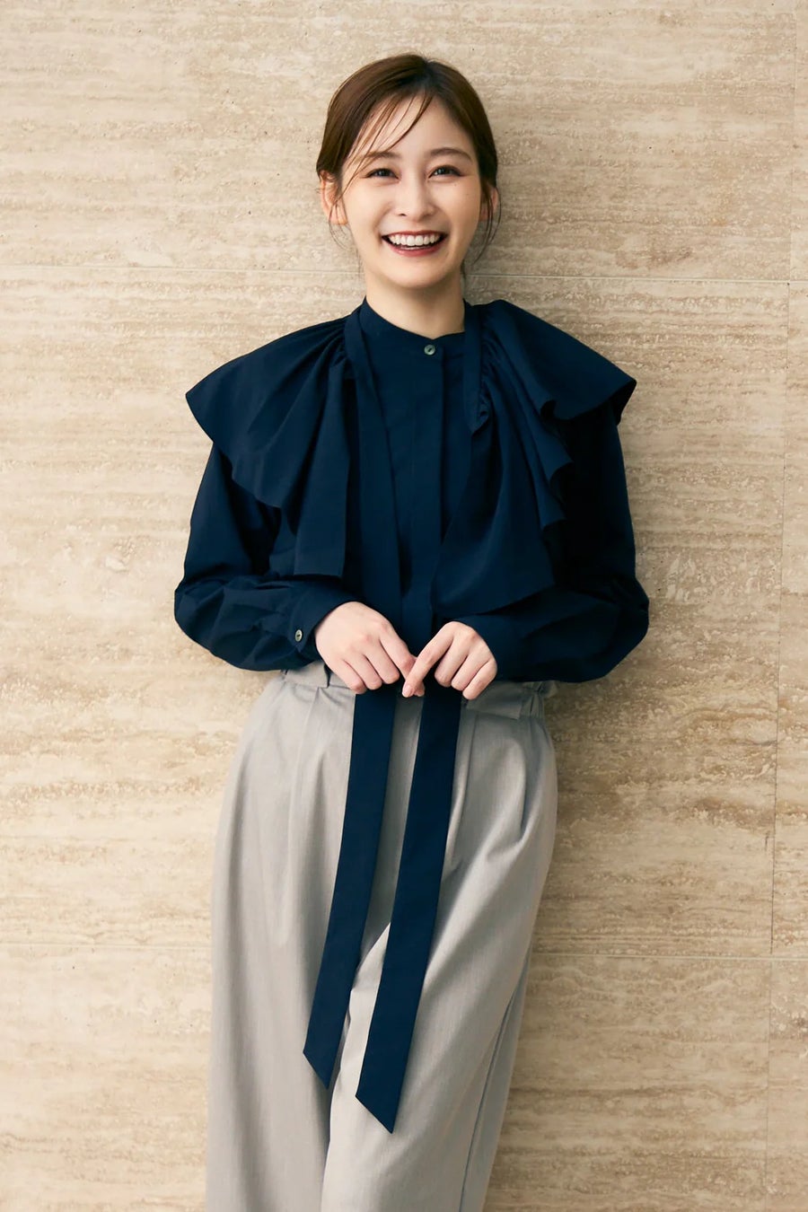 巻き方で表情が変わるボウタイが凛とした佇まいと、柔らかな愛らしさを引き出します。