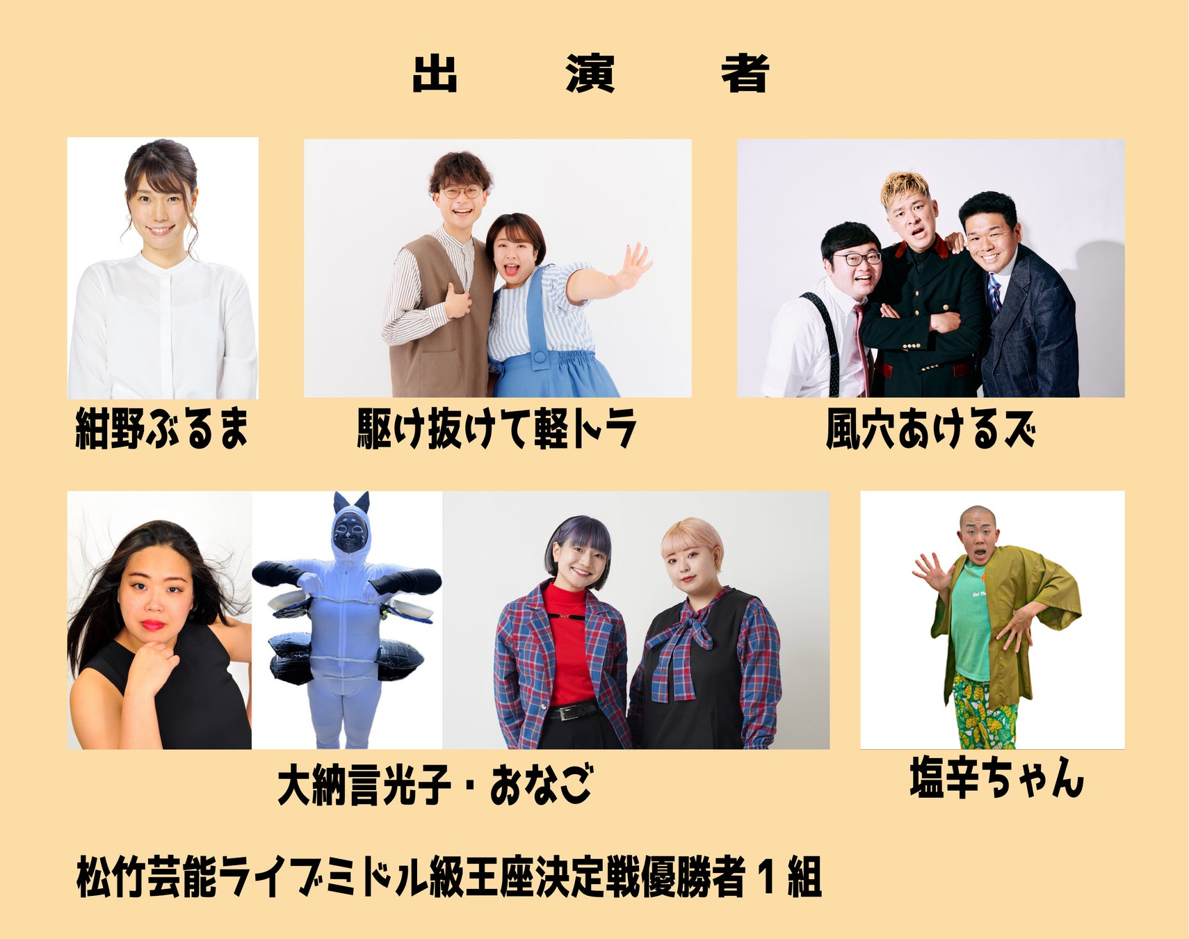 紺野ぶるま、駆け抜けて軽トラ、風穴あけるズ、大納言光子・おなご、塩辛ちゃん、松竹芸能ライブミドル級王座決定戦優勝者1組 |