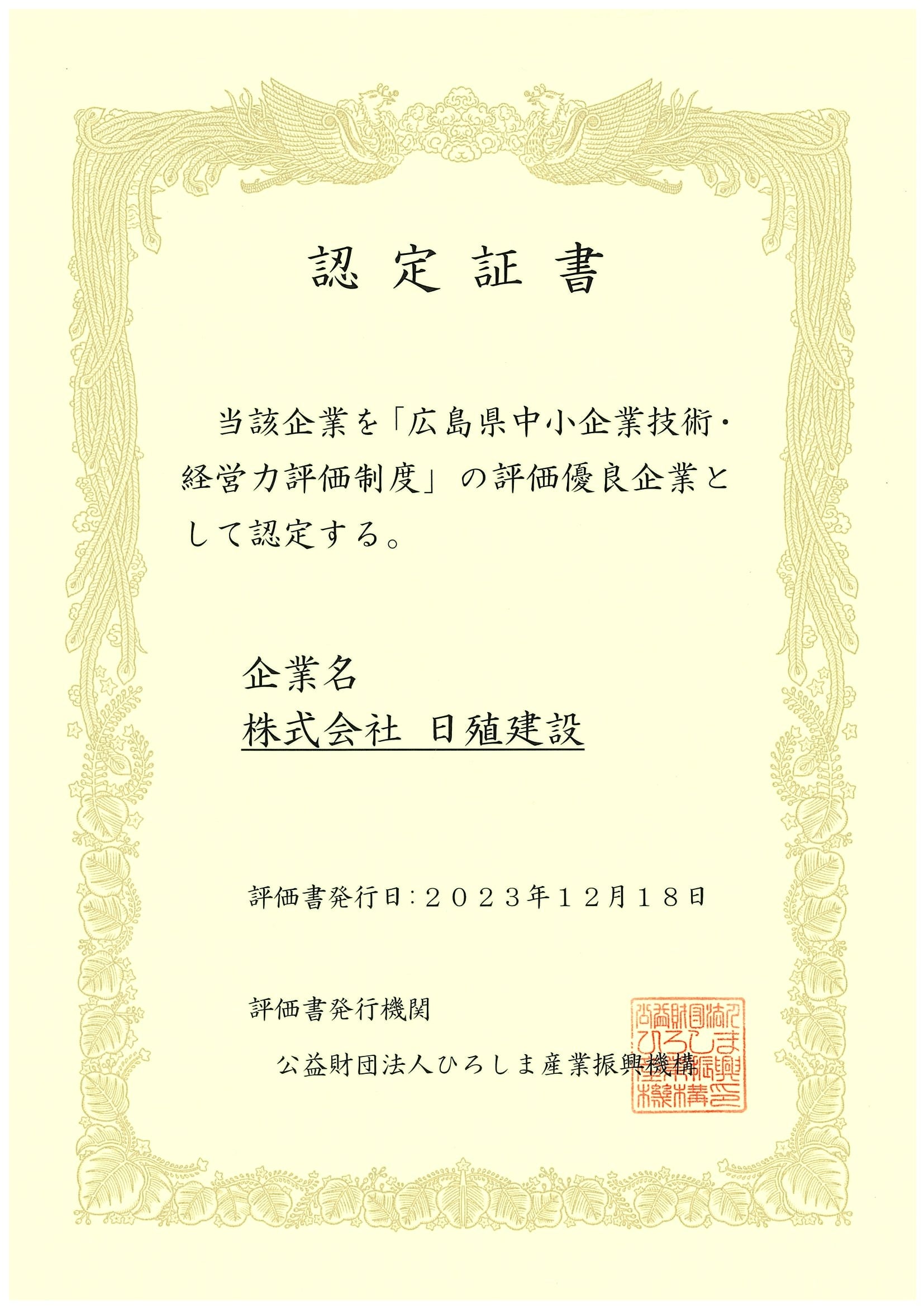 広島県中小企業技術・経営力評価制度における評価優良企業に株式会社日殖建設を認定